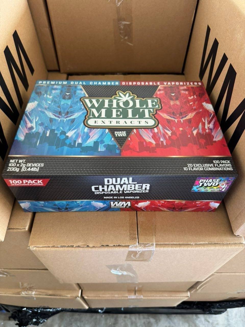 Whole Melt Dual Chamber Disposable – premium 2g device with live resin and liquid diamonds for top-tier flavor, strength, and consistency.